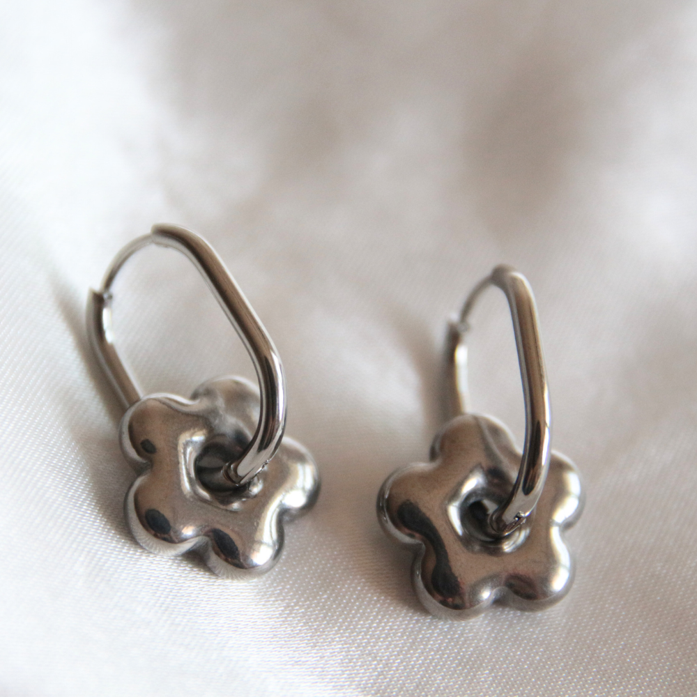 Les boucles d'oreilles fleur argentées en acier inoxydable allient délicatesse et modernité. Chaque boucle est composée d'une fleur finement ouvragée, suspendue à une créole rectangulaire, créant un équilibre harmonieux entre formes organiques et géométriques. La finition argentée confère à ces bijoux une élégance intemporelle, idéale pour rehausser aussi bien une tenue décontractée qu'une tenue plus habillée.
