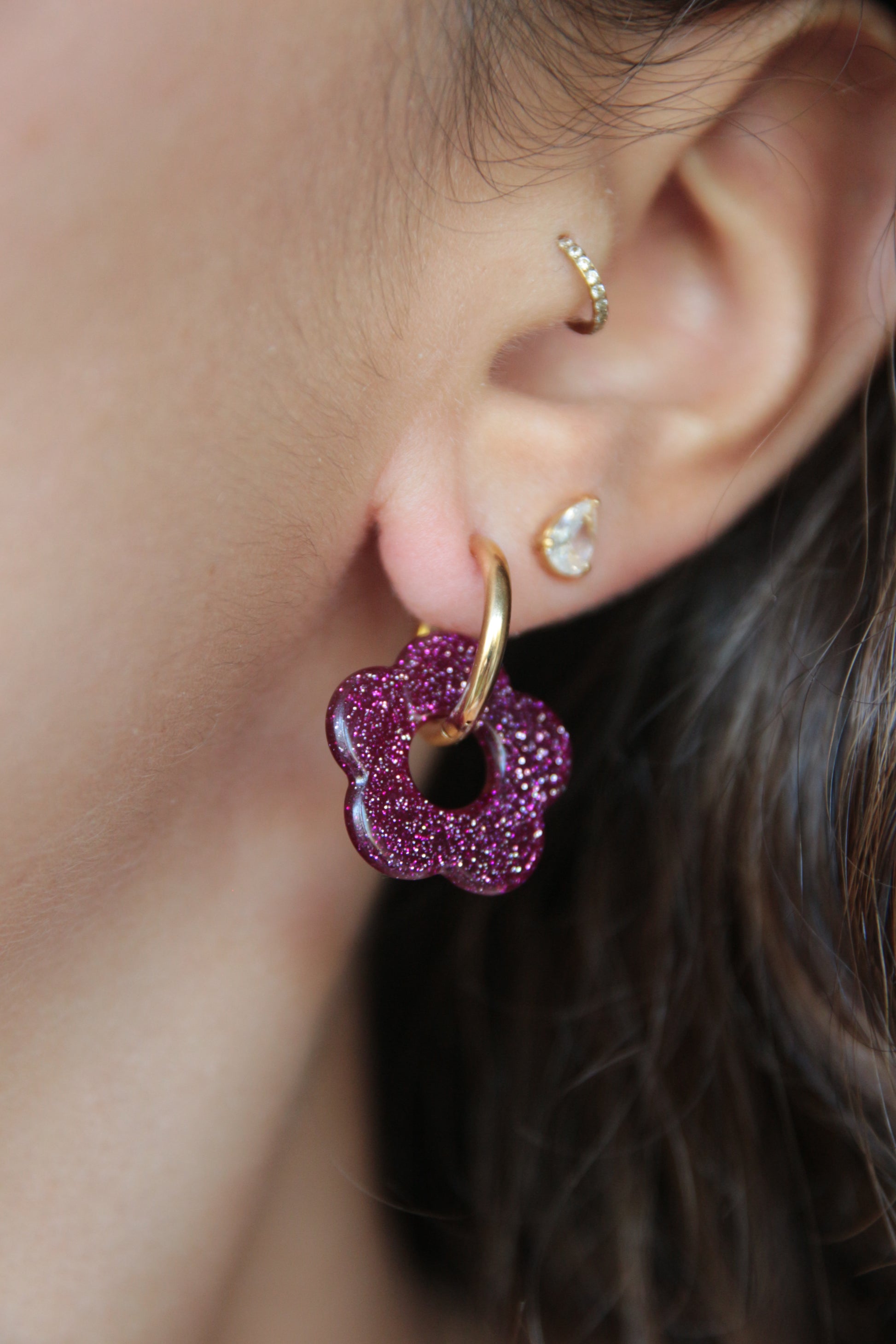 Ces boucles dâoreilles apportent une touche dâĂ©clat et de fantaisie Ă vos looks grĂące Ă leur fleur en rĂ©sine incrustĂ©e de paillettes scintillantes. MontĂ©es sur un anneau dorĂ© en acier inoxydable, elles allient Ă©lĂ©gance et originalitĂ© pour se porter aussi bien au quotidien quâen soirĂ©e. Avec leur taille de 2 cm, elles sont discrĂštes tout en restant remarquables.