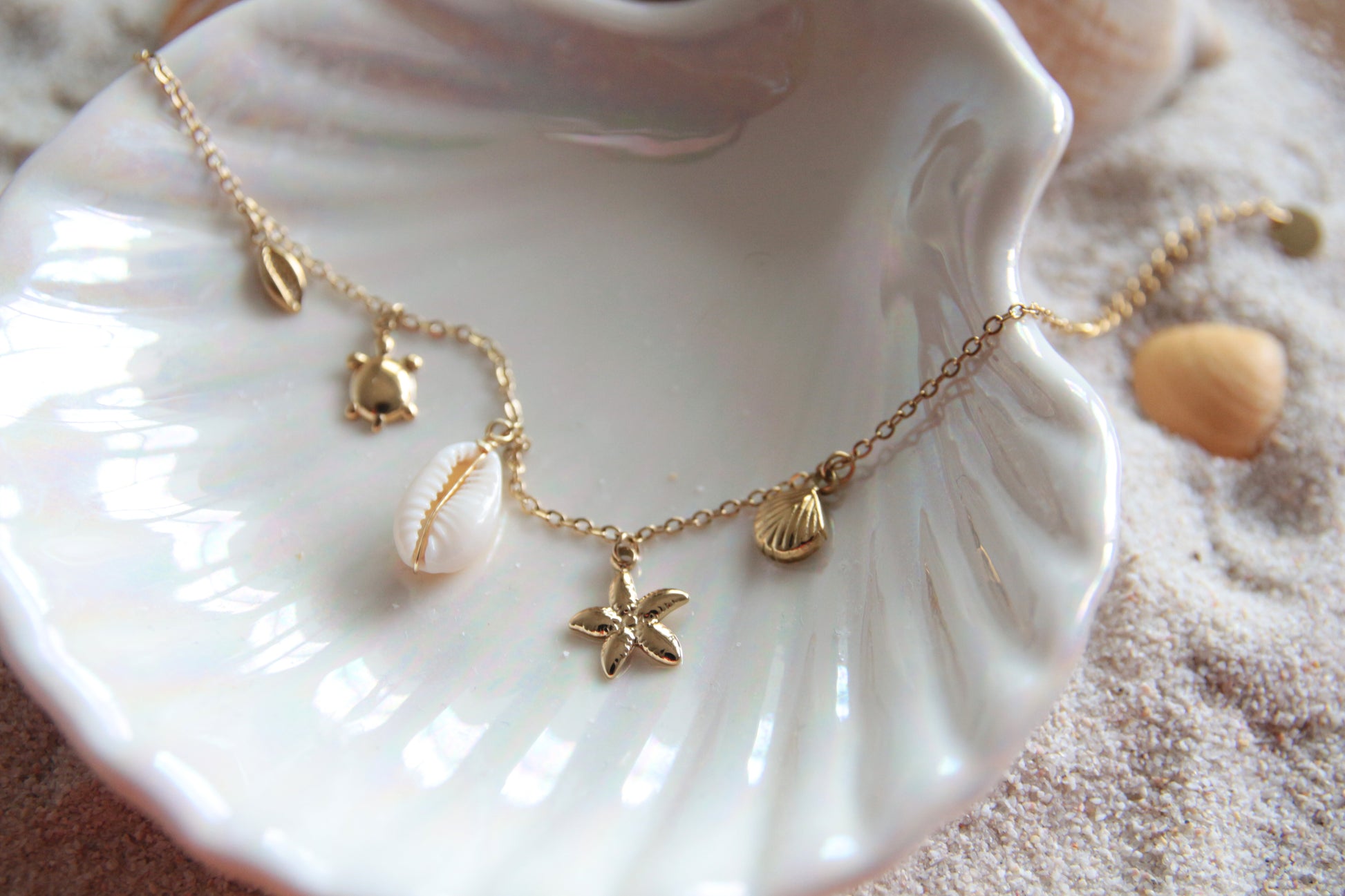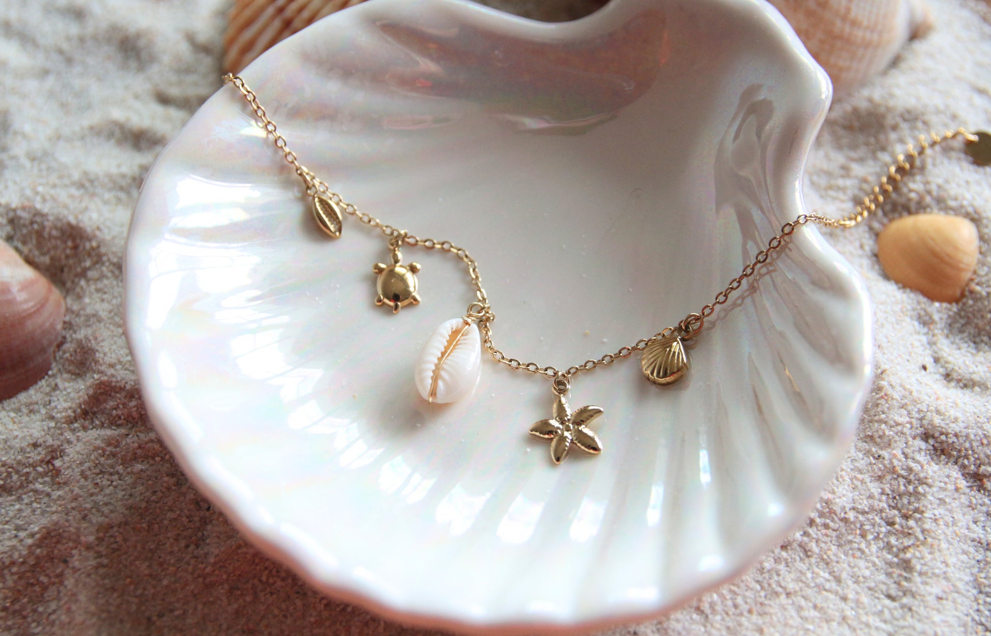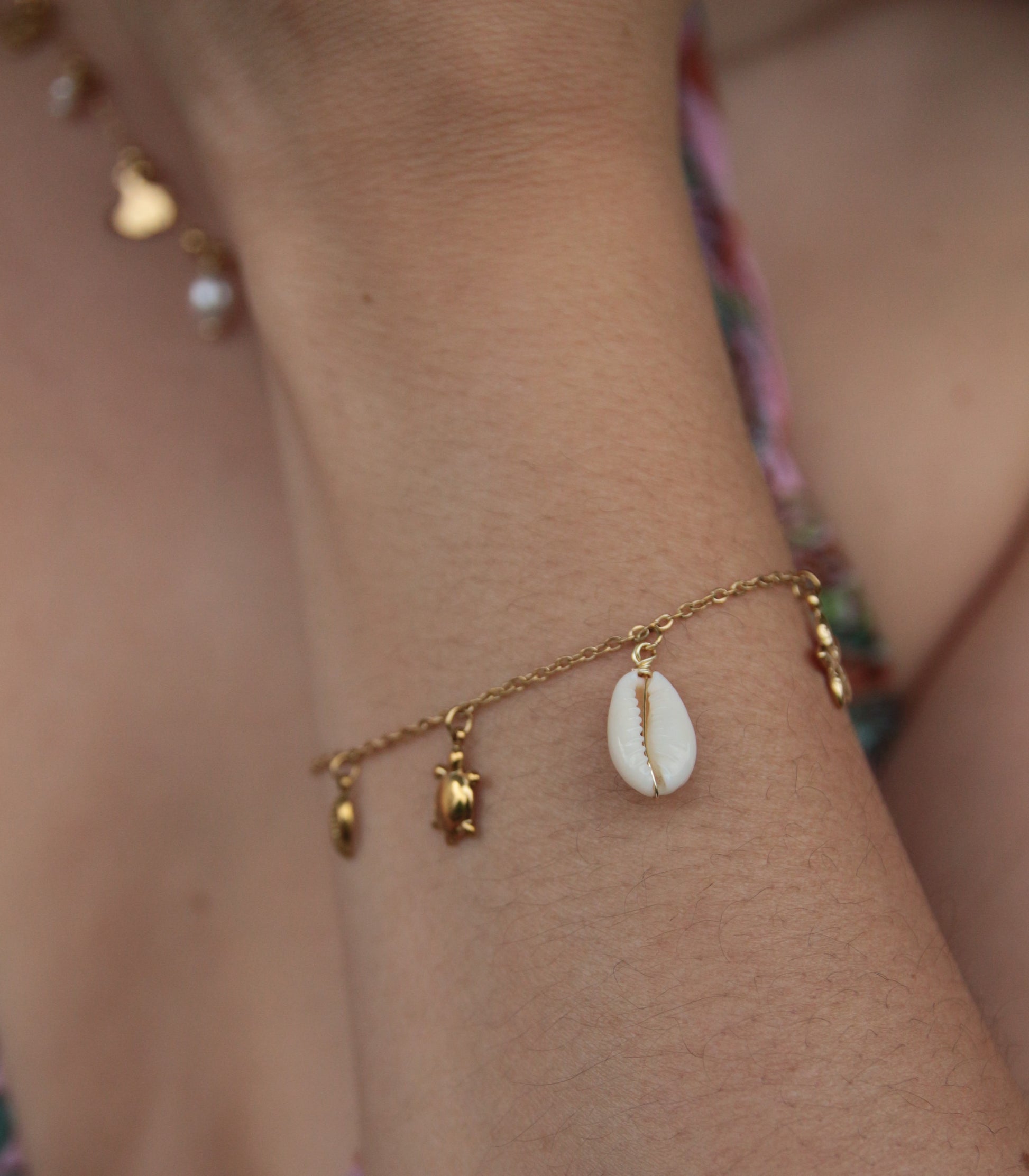 Le bracelet Maui est un bijou fin et délicat, pensé pour accompagner vos journées ensoleillées. Sa chaîne légère en acier inoxydable doré est ornée de charmantes breloques sur le thème de l’océan : mini tortue, coquillages, étoile de mer et un véritable coquillage naturel blanc. C’est un accessoire poétique et raffiné qui rappelle la douceur des vacances et l’appel du large.