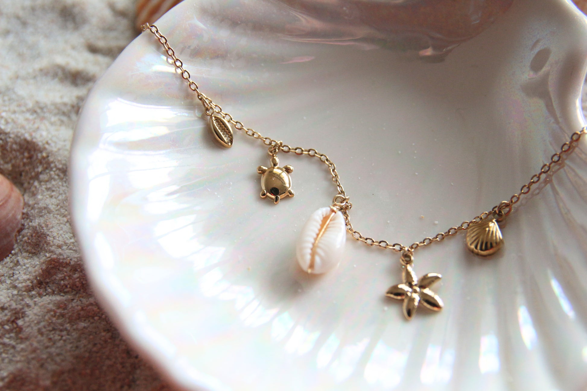 – Breloques : mini tortue, étoile de mer, coquillages en acier inoxydable, + un coquillage naturel blanc