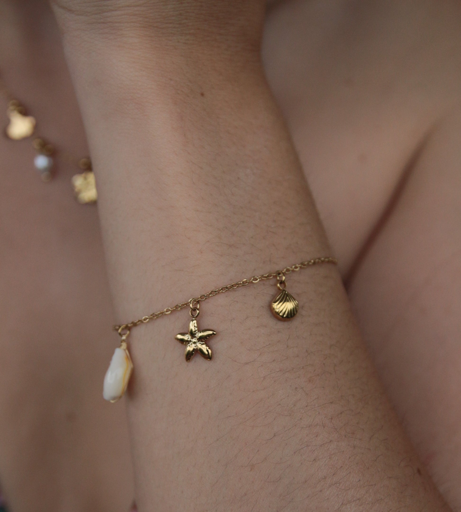 L’association de breloques marines dorées avec le coquillage blanc crée un joli équilibre entre sophistication et authenticité. La finesse du bracelet permet de le porter seul pour un look discret ou empilé avec d’autres pour un effet bohème chic. Chaque détail évoque l’univers marin, apportant une dose de fraîcheur et d’évasion à vos tenues estivales ou quotidiennes.