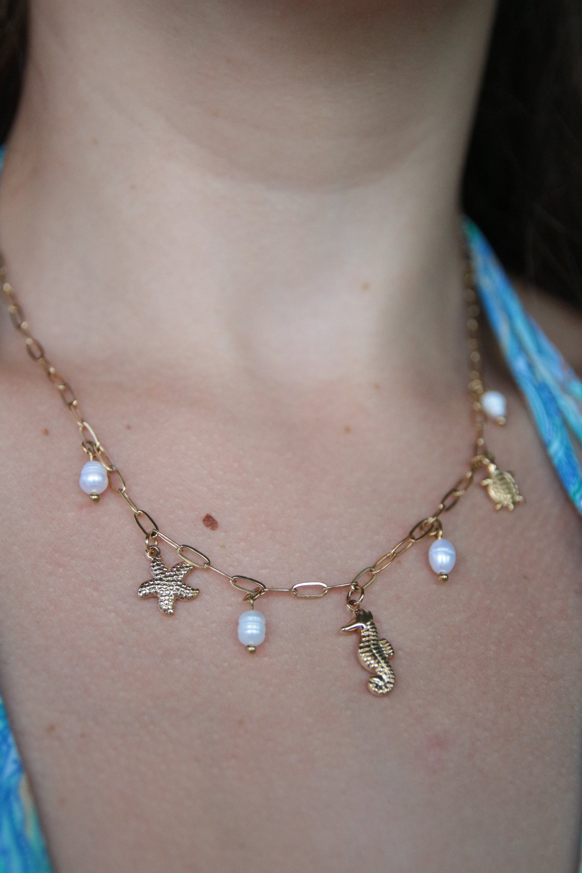 Plongez dans l’univers des fonds marins avec ce collier doré orné de breloques symboliques : hippocampe, tortue, étoile de mer et perles d’eau douce. Chaque élément a été soigneusement choisi pour évoquer la magie de l’océan et l’élégance naturelle. Léger et délicat, ce bijou est parfait pour apporter une touche estivale et poétique à votre style.