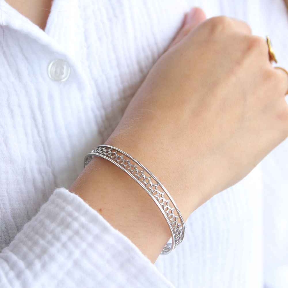 Le bracelet jonc argenté avec ses petites étoiles en acier inoxydable est un accessoire tendance qui apporte une touche délicate à votre style. Sa conception élégante et minimaliste permet de l'associer facilement à d'autres bijoux, créant ainsi un look harmonieux pour toutes les occasions. Ce bracelet se resserre facilement au poignet, offrant un ajustement parfait et un confort optimal.