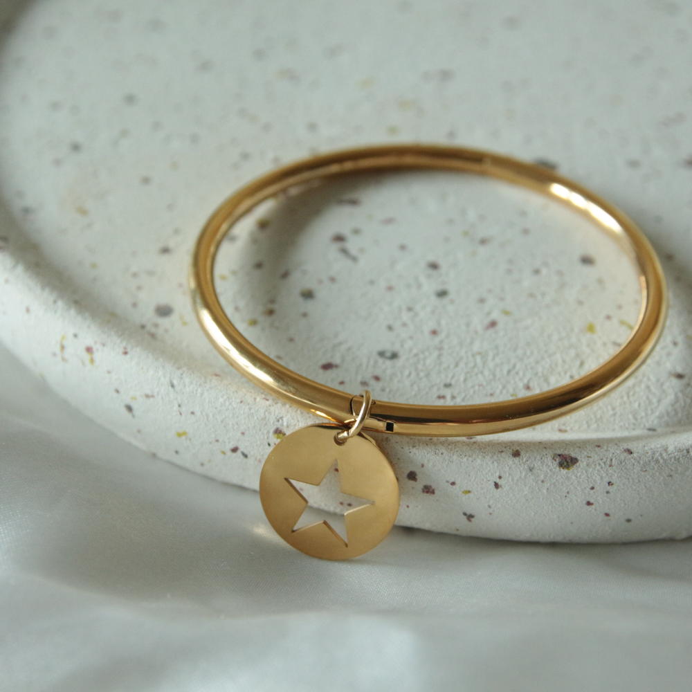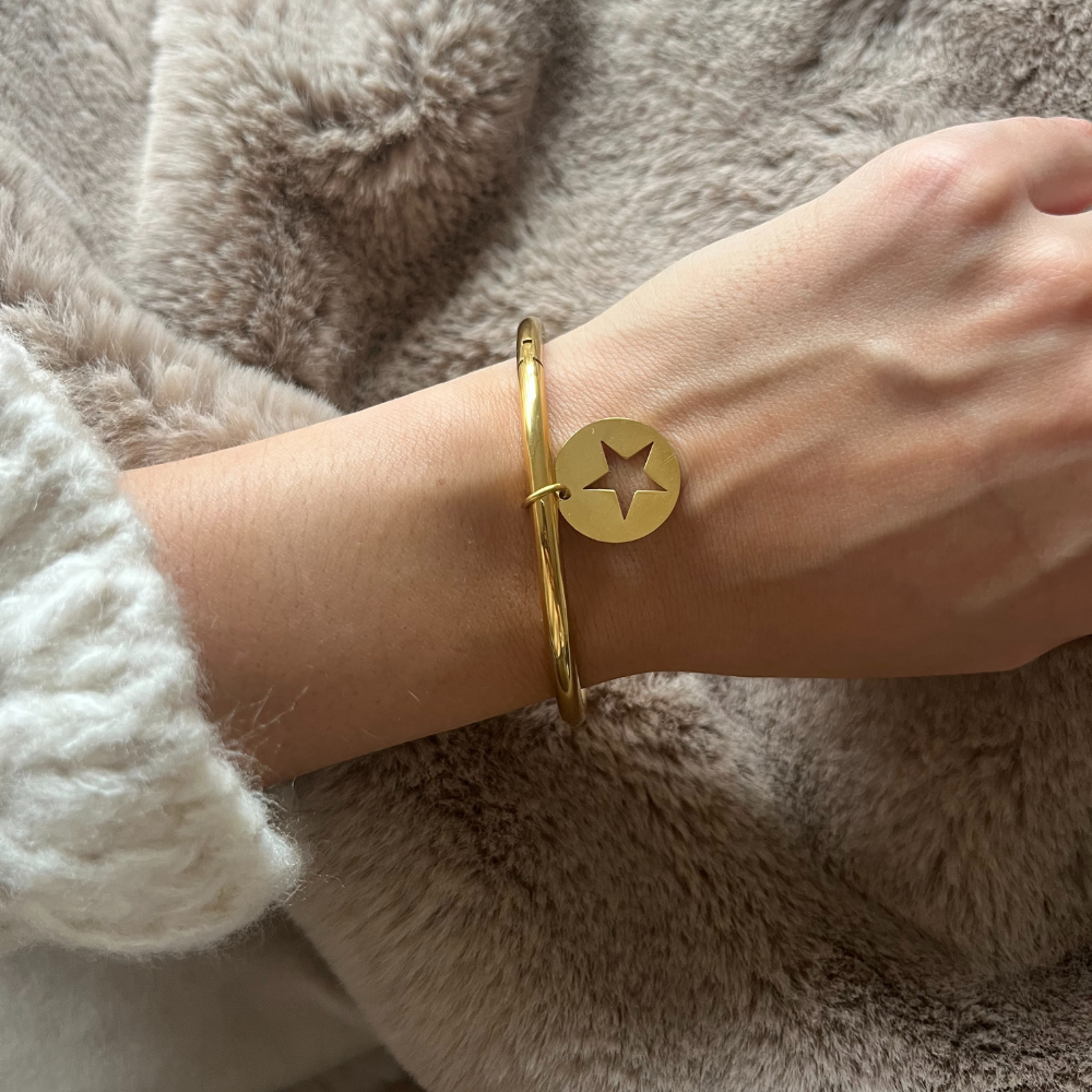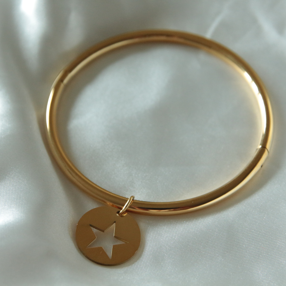 Choisissez le jonc breloque avec étoile dorée dans un cercle pour exprimer votre sens du style de manière délicate et élégante. Idéal comme cadeau pour un être cher ou pour vous faire plaisir, ce bracelet séduira celles qui apprécient les accessoires raffinés et originaux. Associez-le à d'autres bracelets pour un look superposé tendance ou portez-le seul pour laisser le design s'exprimer pleinement. Avec ce jonc, chaque moment devient une occasion de briller, transformant votre poignet en un véritable écrin de style et de sophistication.