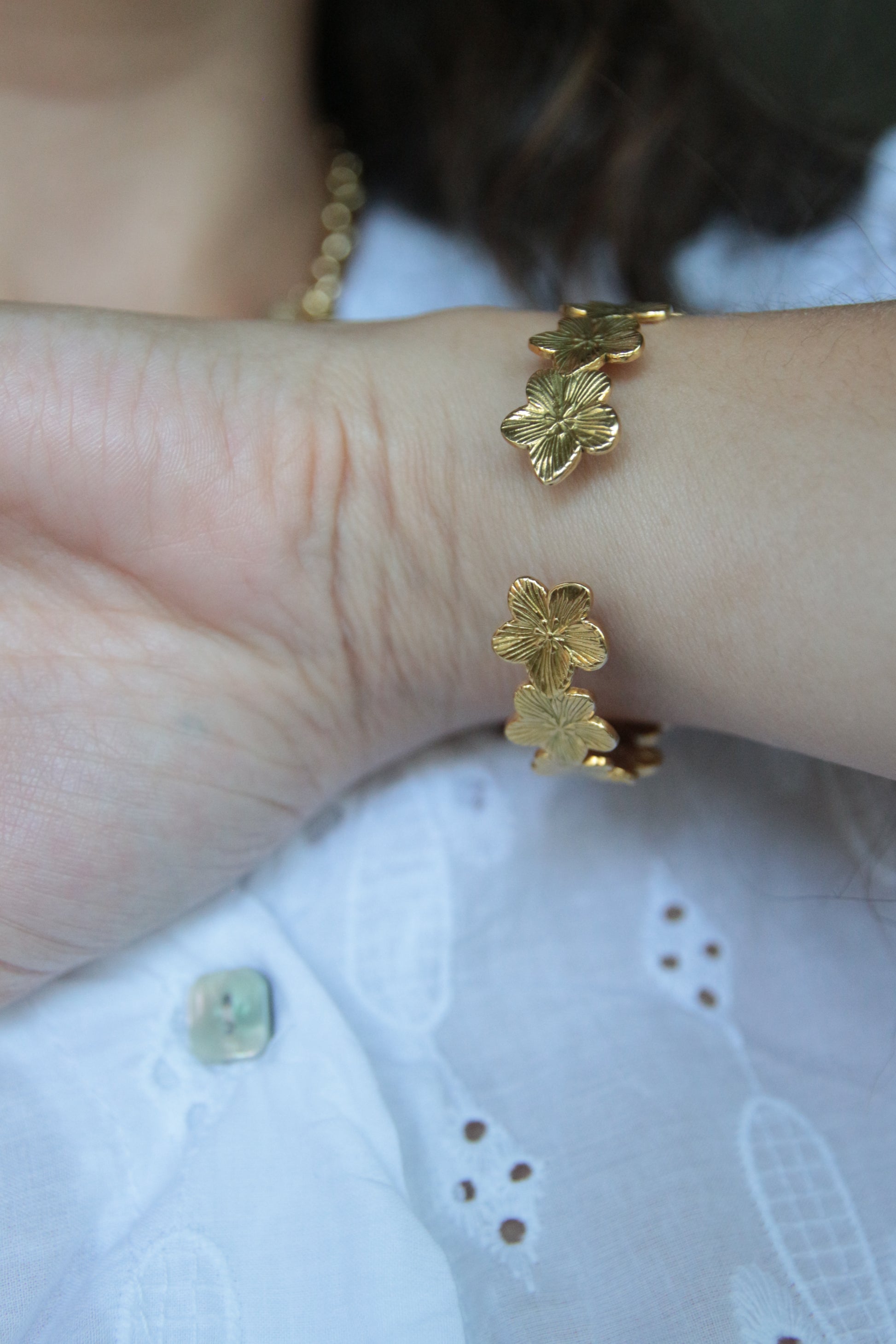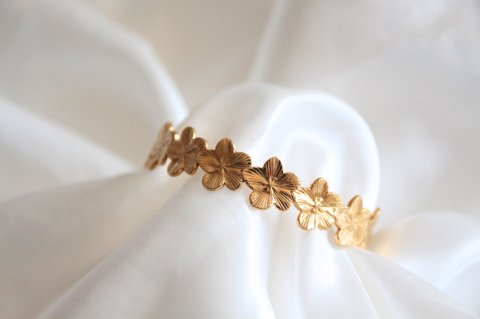 Le jonc Rosy est un bijou raffiné en acier inoxydable doré, orné de petites fleurs délicates qui se succèdent harmonieusement tout autour du poignet. Avec son design élégant et intemporel, il apporte une touche romantique et féminine à vos tenues, qu’elles soient du quotidien ou pour des occasions spéciales.
